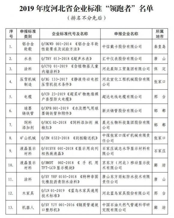 日前,河北省市場監(jiān)督管理局發(fā)布《2019年度河北省企業(yè)標準“領跑者”名單》,晨……