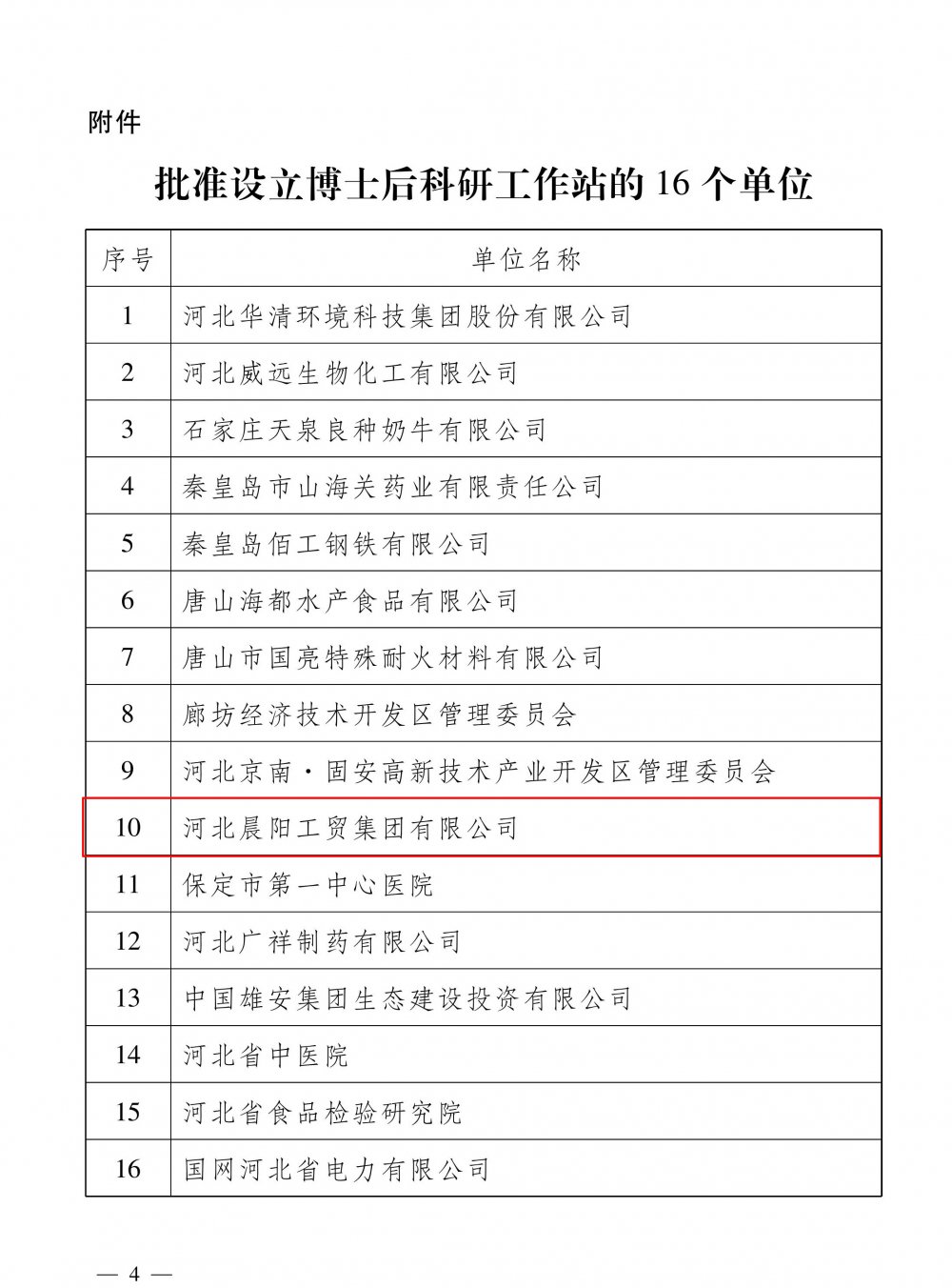 河北晨陽工貿集團被批準設立博士后科研工作站